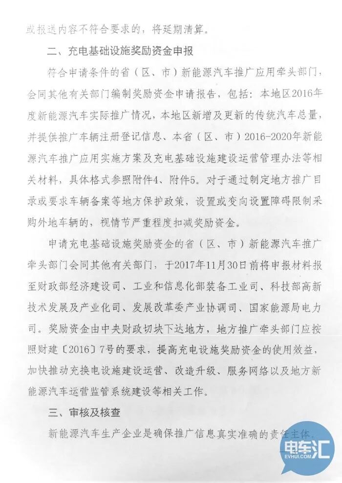 充電設施方面,符合申請條件的省(區(qū)、市)新能源汽車推廣應用牽頭部門,會同其他有關部門編制獎勵資金申請報告,包括:本地區(qū)2016年度新能源汽車實際推廣情況,本地區(qū)新增及更新的傳統(tǒng)汽車總量,并提供推廣車輛注冊登記信息、本?。▍^(qū)、市)2016-2020年新能源汽車推廣應用實施方案及充電基礎設施建設運營管理辦法等相關材料。通知還強調(diào),對于通過制定地方推廣目錄或要求車輛備案等地方保護政策,設置或變相設置障礙限制采購外地車輛的,視情節(jié)嚴重程度扣減獎勵資金。充電設施獎勵資金申報截止期為2017年11月30日。