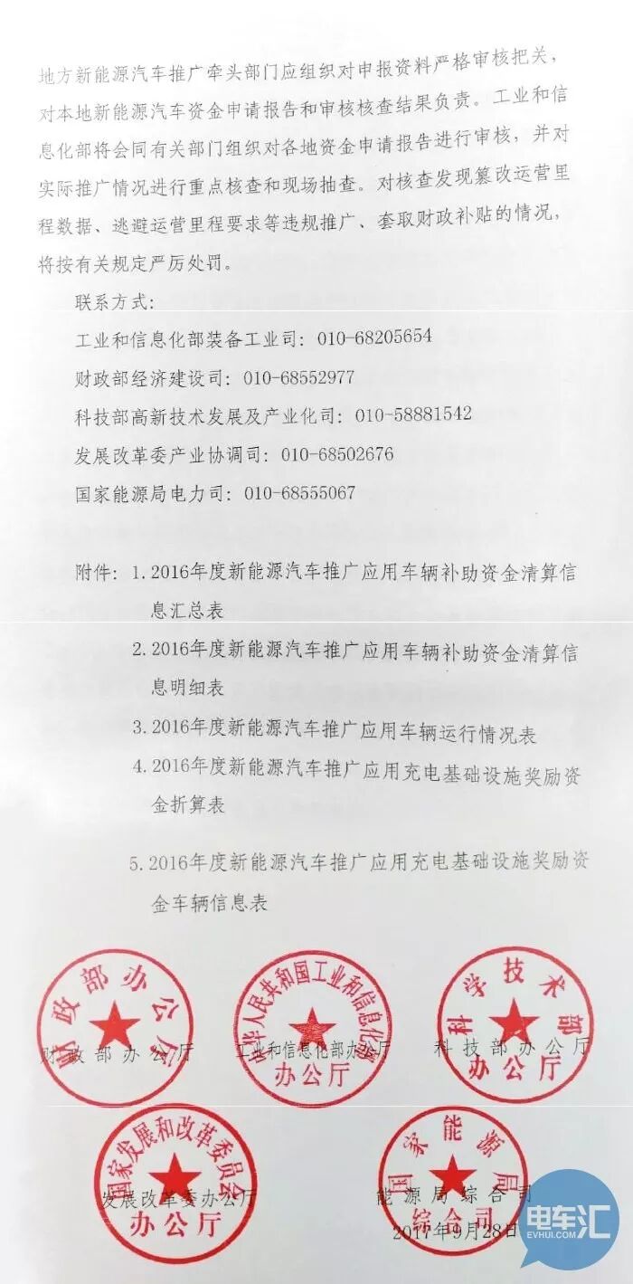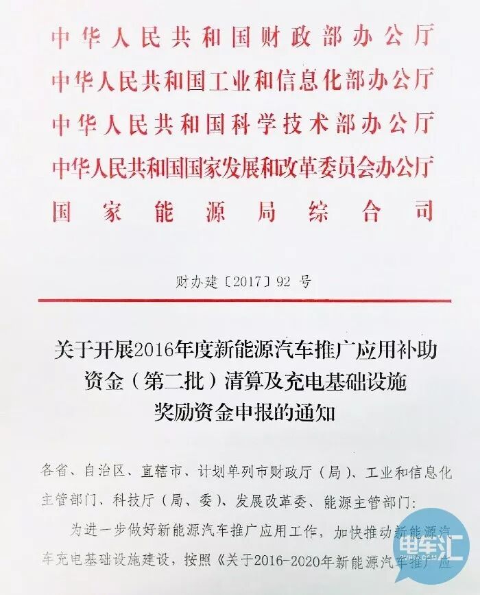 電車匯消息:據(jù)報道,工信部、發(fā)改委、財政部、科技部、能源局5部門聯(lián)合發(fā)布《關于開展2016年度新能源汽車推廣應用補助資金(第二批)清算及充電基礎設施獎勵資金申報的通知》,要求各?。▍^(qū)、市)新能源汽車推廣牽頭部門會同財政等部門,提交本地汽車生產(chǎn)企業(yè)2016年度中央財政補助資金清算報告及產(chǎn)品銷售、運營相關證明材料。