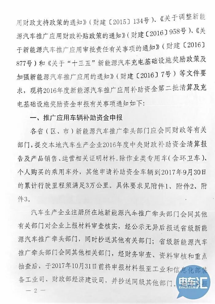 通知指出,除作業(yè)類專用車(含環(huán)衛(wèi)車)、個人購買的乘用車外,其他申請補助資金車輛到2017年9月30日的累計行駛里程須滿足3萬公里。本次申報截止期為2017年10月31日。